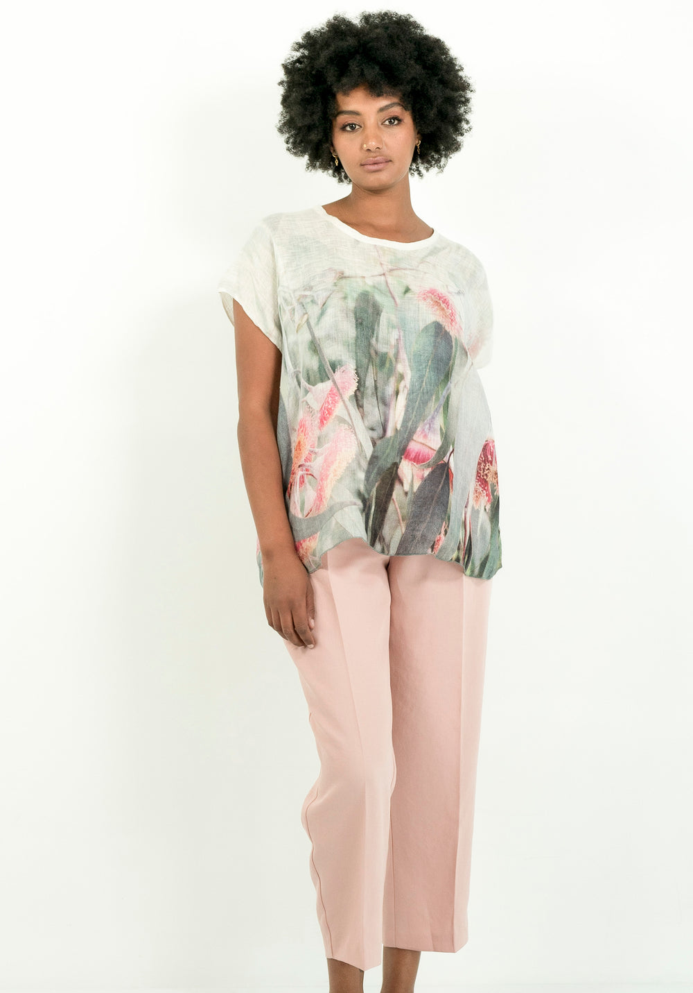This one size Linen Top features a 'flowering pink Eucalyptus, the Silver Princess' which was captured from a photograph that was taken at King Park Botanic Gardens, Western Australia.