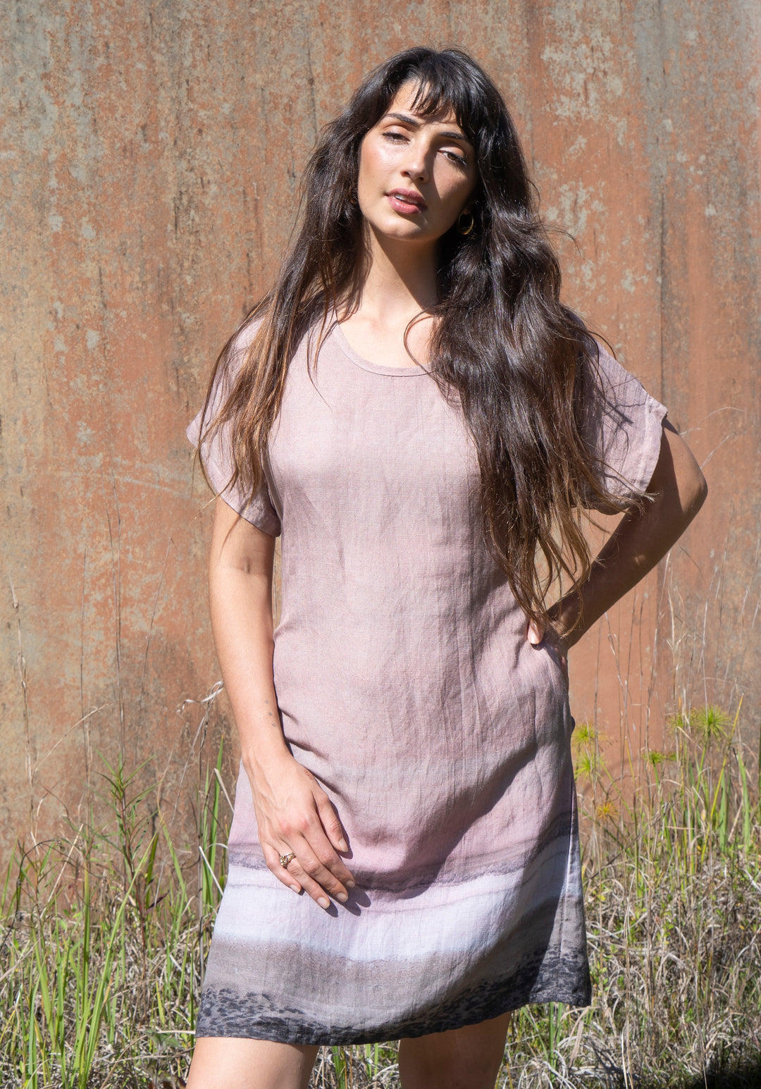 This knee length Linen Tencel Dress features an amazing 'Salt Pink Lake' captured from an aerial photograph taken during a visit to Southern Western Australia.