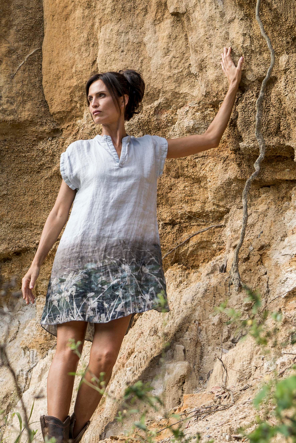 This V-neck Hemp Dress features 'wild Blue Gum' captured from a photograph that was taken while visiting Southern Tasmania.