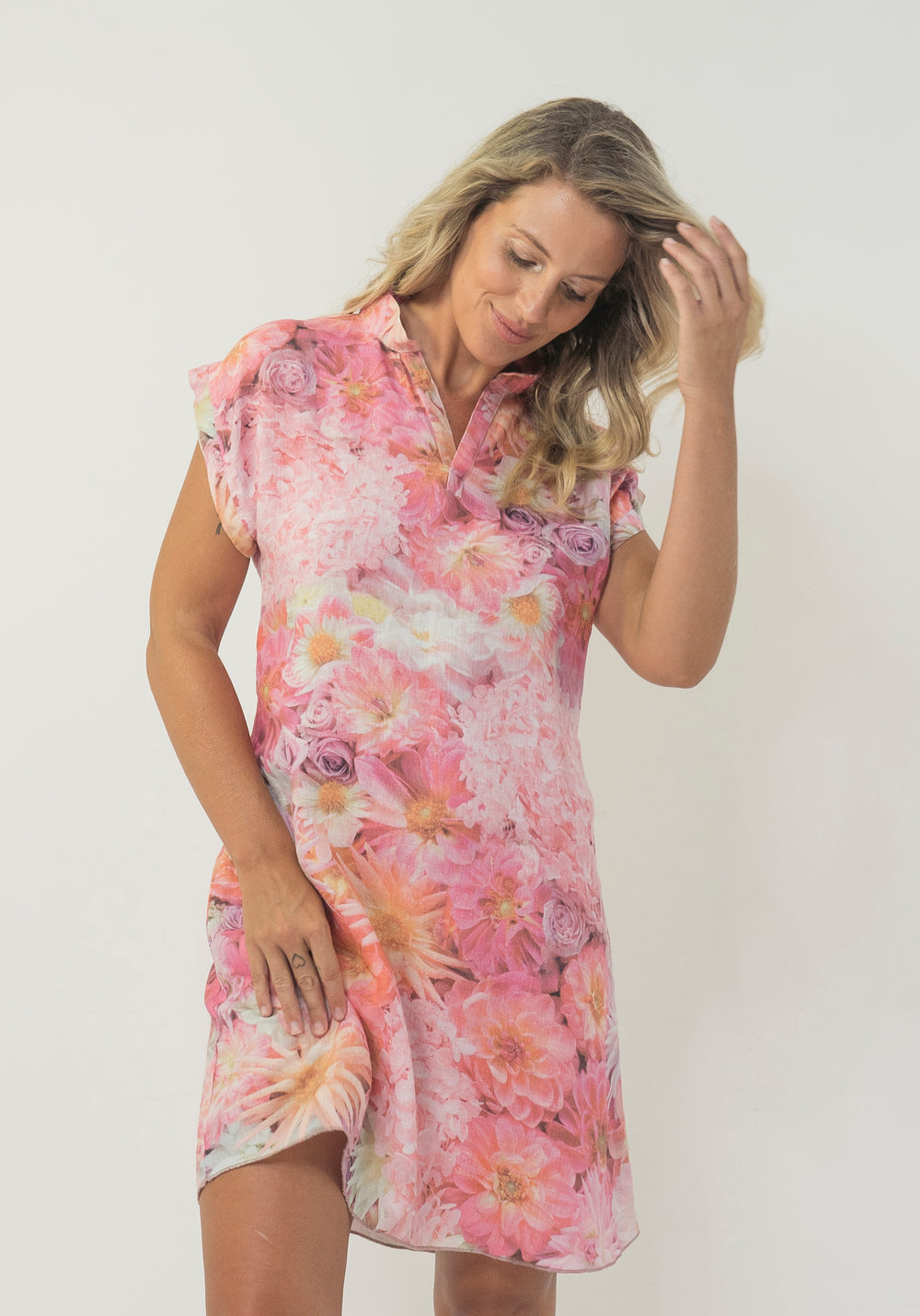This V-neck Hemp Dress features 'Dahlias and Roses' which Harriet captured in a photograph after visiting a flower farm in Coorabell, Byron Bay.
