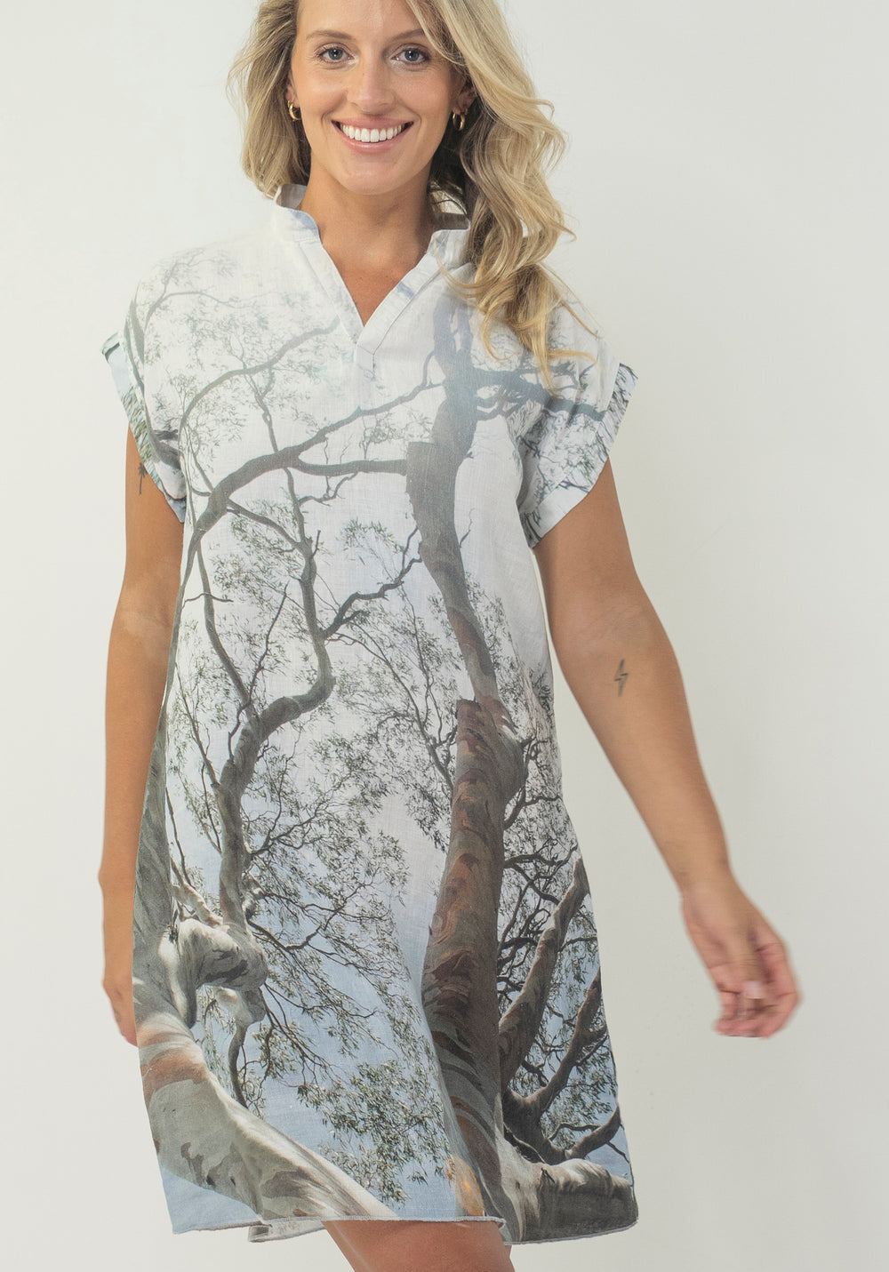 This V-neck Hemp Dress features a 'stunning Ghost Gum' which Harriet captured in a photograph after visiting Lake St Clair, Tasmania.