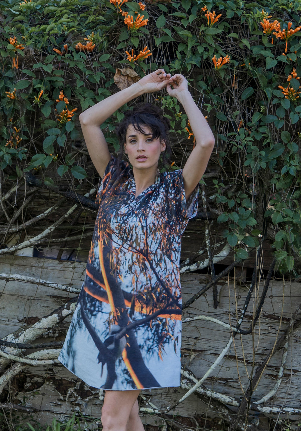 This V-neck Hemp Dress features 'Kookaburras on sunset' captured in a photograph which was taken in Harriet's garden in the hills of Byron Bay.