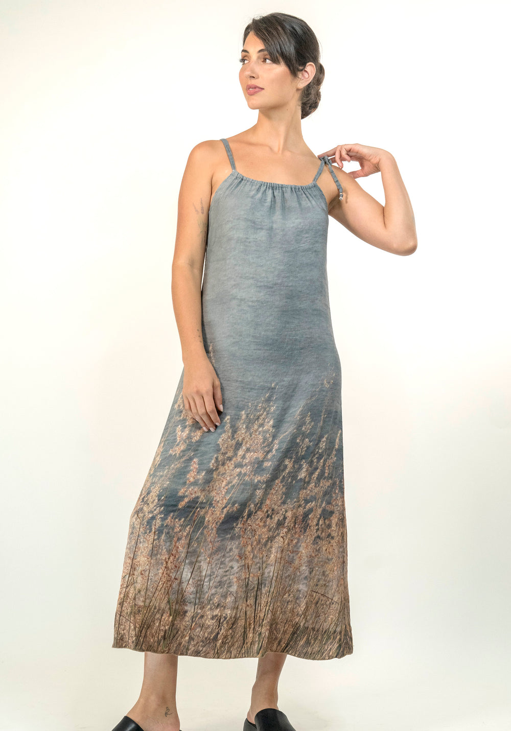 This long flowing Linen Tencel Dress features 'ocean views through grasses' captured from a photograph looking out from the Byron Bay lighthouse.