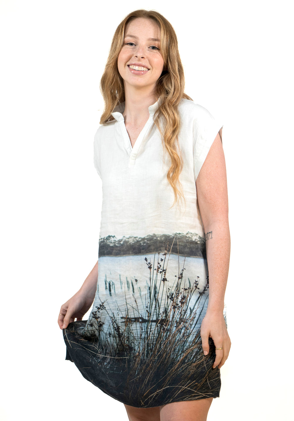 This V-neck Hemp Dress features a 'shoreline on sunset captured from a photograph that was taken while visiting Strahan on the West Coast of Tasmania.