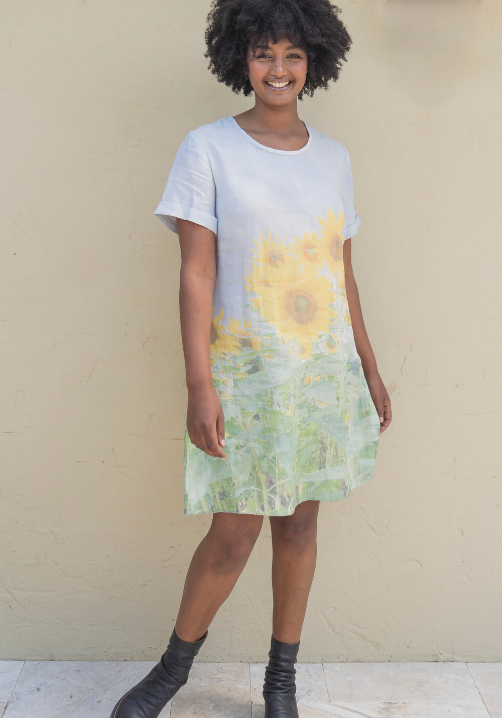 This knee length Linen Dress features 'Sunflowers' captured from a photograph that was taken while visiting the flower farm Pict, Myocum Rd Byron Bay.