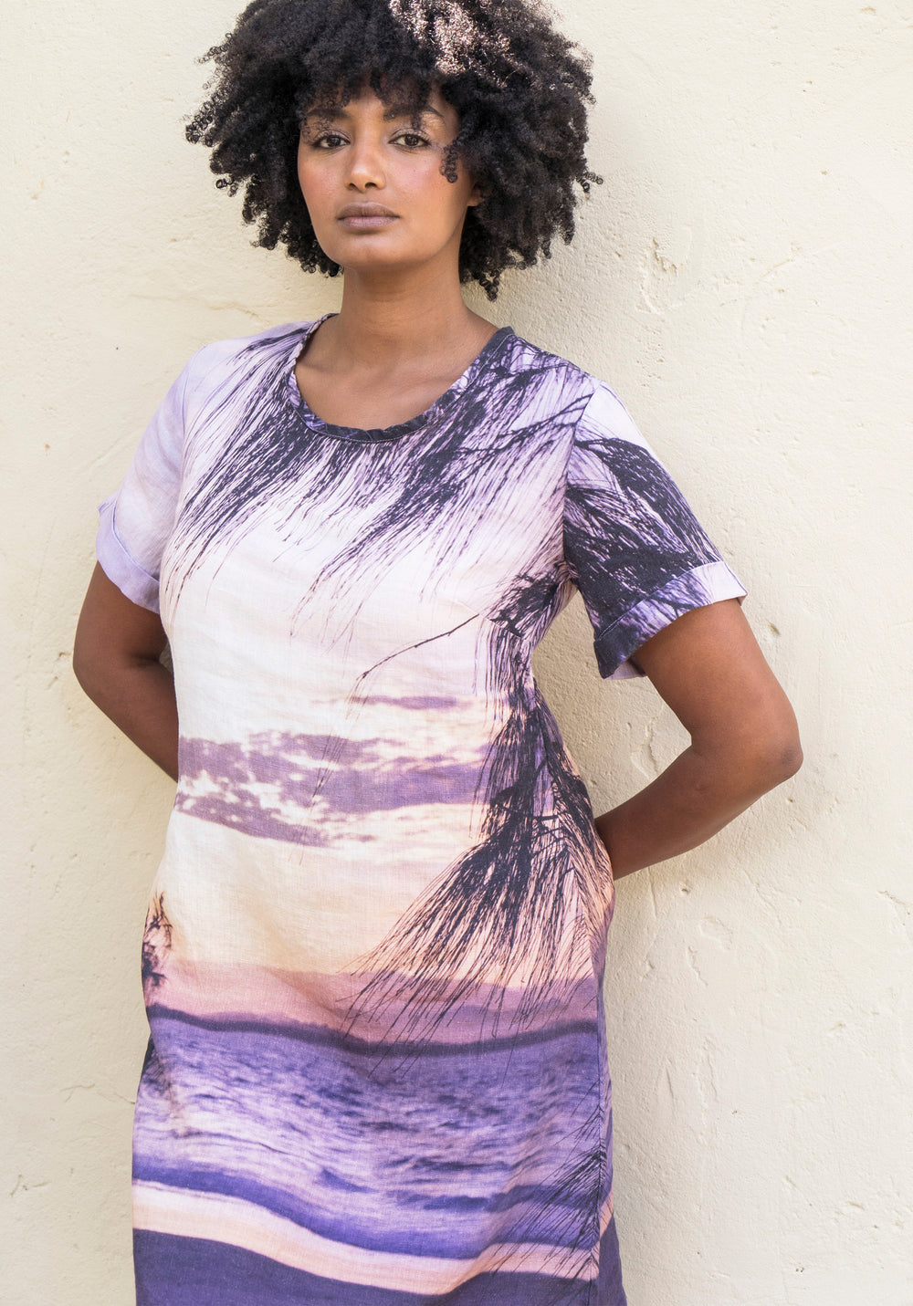 This knee length Linen Dress features a 'sunset on Wategos beach' captured from a photograph that was taken in Byron Bay.