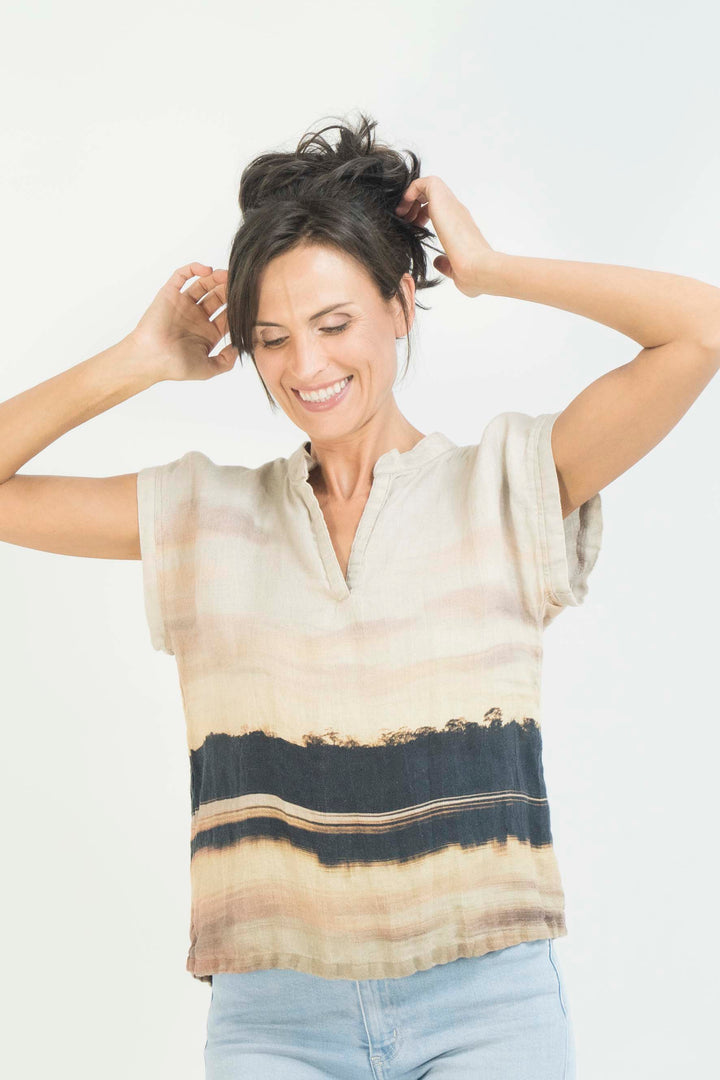 This V-neck Hemp Top features a 'sunset on the Derwent River' captured from a photograph that was taken while visiting Hobart, Tasmania.