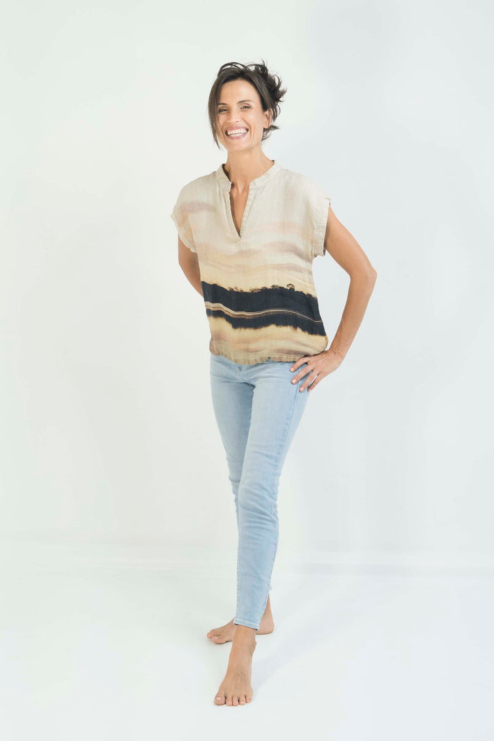 This lovely soft hemp top has a beautiful texture. Featuring a V-neck placket, stand collar and a capped sleeve extension, this relaxed design suits most body types.