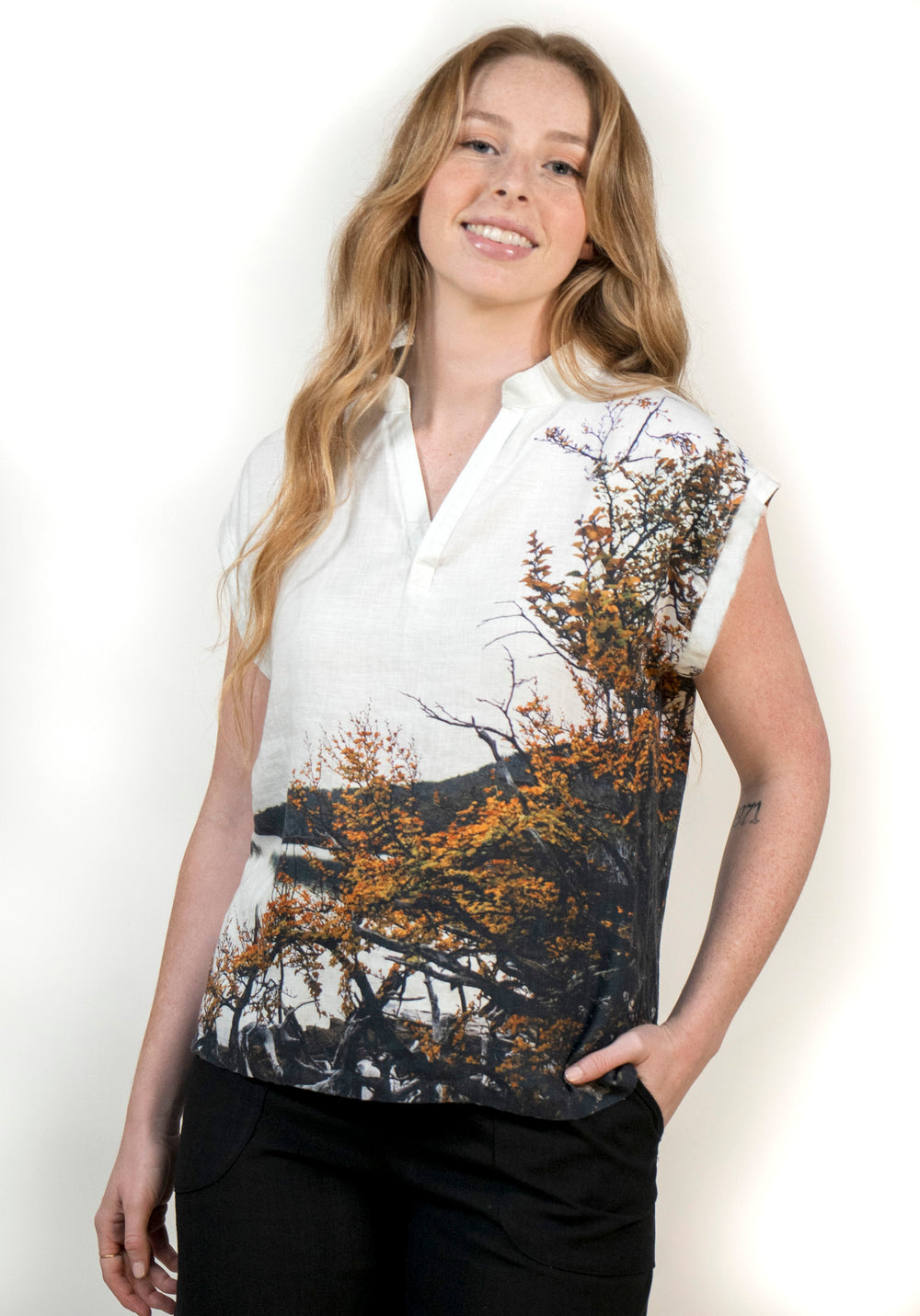 This V-neck Hemp Top features 'the turning of the Fagus Beech Tree ' native to Tasmania which was captured from an aerial photograph that was taken while at Fenton Lake, Mt Feild National Park Tasmania.