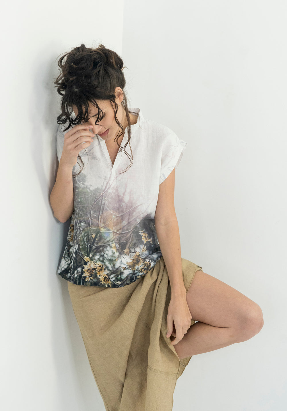 This V-neck Hemp Top features 'dried Maple seed pods' captured from a photograph that was taken in Harriet's garden, in the hills of Byron Bay.