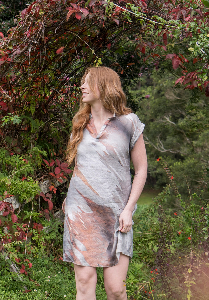This V-neck Hemp Dress features the 'bark of the Ghost Gum tree' captured from a photograph that was taken while visiting Lake St Clair, Tasmania.