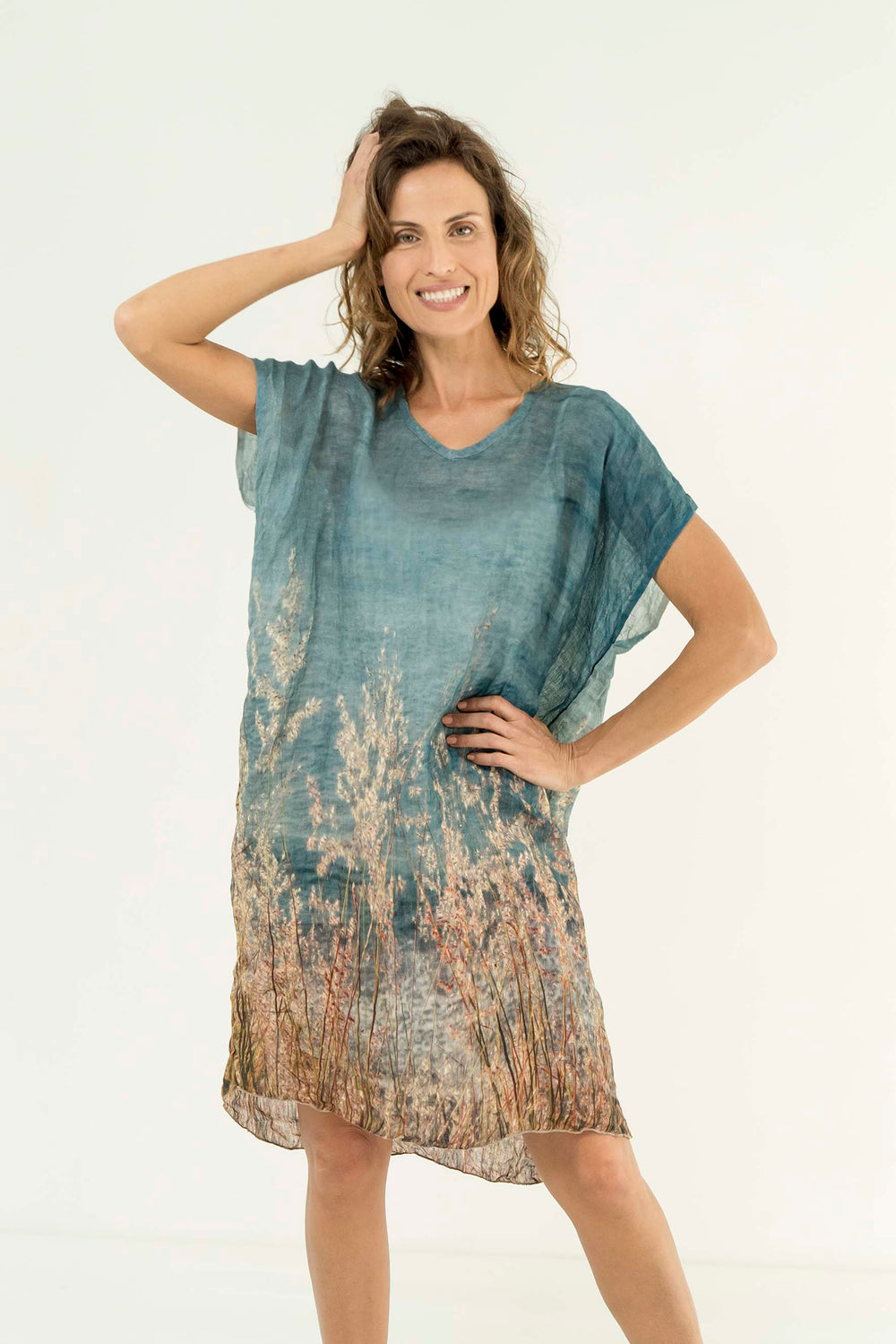 This one size Linen Kaftan features 'ocean views through grasses' captured from a photograph that was taken looking out over the ocean from Byron Bay lighthouse.