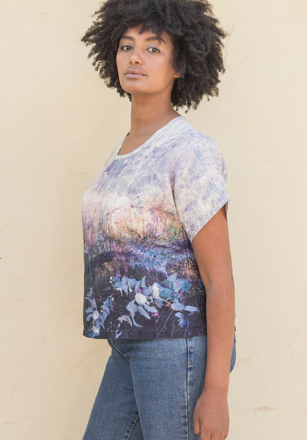 This photo is printed on a lovely, soft, light weight linen. The T-shirt is a relaxed and comfortable cut, with a Magyar sleeve. As we are a handmade label we can also make any small personal changes, like a V-neck, XS or changes to hem length. Shoot us an email to confirm or add a request in notes at check out.