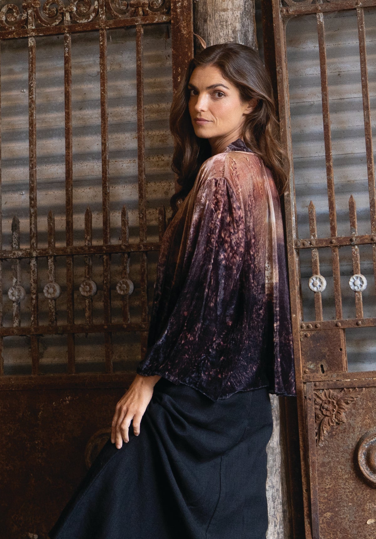 The photo is digitally printed onto a beautifully soft silk and rayon velvet, the shimmer of the silk adding life to the print. Kimono features a fitted sleeve and front band.