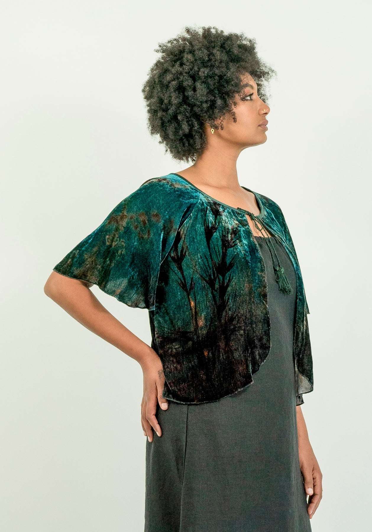 The photo is digitally printed onto a beautifully soft silk and rayon velvet for this Bolero jacket. The shimmer of the silk adding life to the print. Bolero features a raglan loose sleeve and front tie.